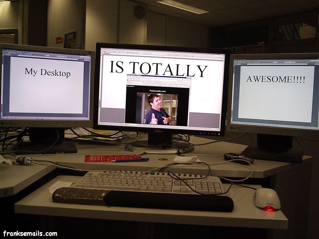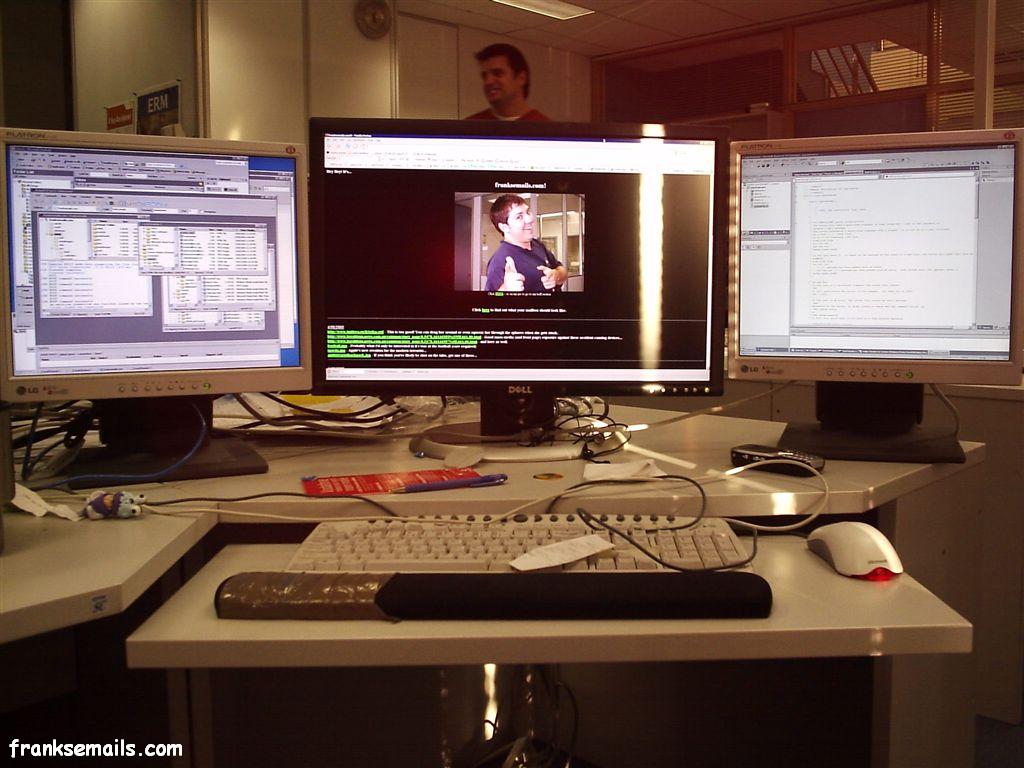 Wow, I gotta admit, these screens are pretty awesome - 2xLG 17" LCD puppies that do 1280x1024 and a 24" Dell LCD that does 1920x1200. Working with them takes up almost all of your field of vision and makes you dizzy just looking at them.
