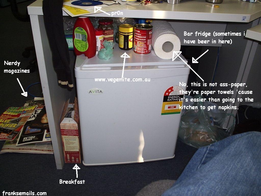 How the hell do I get away with having my own fridge at work?! And no, it's not one of those pussy peltier effect fridges that can only hold 6 cans and that you can easily smuggle in through reception and hide, this puppy's a 60 litre and uses a compressor - and I carried it in through the front door.
